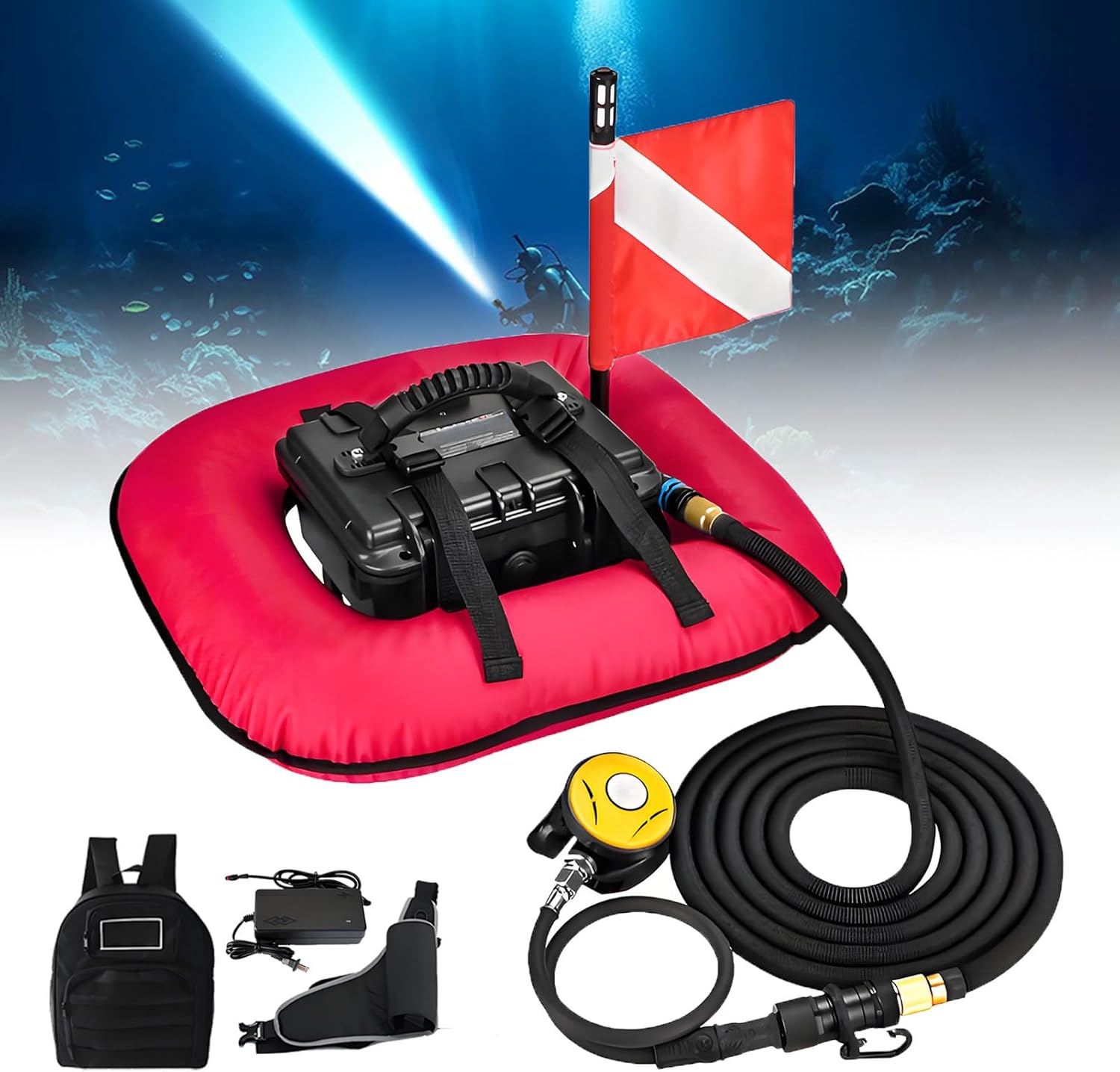 Portable Diving System – The ultimate solution for your underwater adventures!Upgraded Scuba Diving System featuring a removable battery for easy swaps and extended dives of up to 60-70 minutes, it ensures you stay underwater longer. With an enhanced air intake and a reinforced hose, enjoy smoother breathing even in rough conditions. Dive deeper and breathe easier—upgrade your dive gear today!Perfect for a variety of uses – Recreational diving, underwater photography, fishing, scientific research, and underwater maintenance. The system adapts to your diving needs, providing reliable air supply in diverse underwater scenarios【Specification】Product name: Diving VentilatorMaterial: ABS, Aluminium AlloyColors: Blue, RedMotel: Single-Battery, Dual-BatteryUse depth: 9mBattery capacity: 12600mah/151whBattery operating time: 60~70minProduct Size: 27*21*23cm /10.6*8.3*9.1inchRated power: 180WAir supply: 52 liters/minVoltage: 11.1 Volts【Single-Battery Packing List】Diving Ventilator *1Charger *1Backpack *1Diving Harness *1【Dual-Battery Packing List】Diving Ventilator *1Charger *1Backpack *1Diving Harness *1Spare Air Tube *1Spare Battery *1Spare Airbags Liner *1【Notice】1.The device can only be used in water. Do not use in places with strong waves.2.After using in seawater, rinse the device with fresh water immediately to prevent corrosion of the device.3.Before using in water, please make sure the charging cover is tightly closed.4.Non-professional divers should dive under the guidance of professional divers.